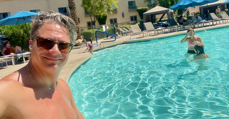 En lördag i Scottsdale, Arizona när min dotter åkte iväg och träffade sin gamla värdfamilj så satte jag mig vid poolen och läste en bok. Det var varmt! Satte mig på poolkanten med benen i vattnet. Lade märke till ett barn som sprang och hoppade ned i poolen precis bredvid mig. Vattnet stänkte på mig. Hon gjorde om det och igen, både jag och nu också min bok blev blöt. Hennes mamma kommer springande och ursäktade hennes dotters beteende. Jag svarade att det inte var något problem, hon var ju här före mig dessutom var det skönt med att få lite vatten på sig, sa jag. ”Men din bok då, den blev ju blöt.” svarade hon. Den har bara fått lite mer karaktär, svarade jag. Hon bad om ursäkt igen och gled ned i poolen till sin dotter. Det var nu det slog mig. Wow! Vad artig hon var och hur vänlig jag var tillbaka. Kände inte igen mig! Jag tog en bild för att bevara känslan. Resten av vistelsen i USA funderade jag vidare och insåg att jag är en mycket trevligare och lugnare man när jag är i USA.